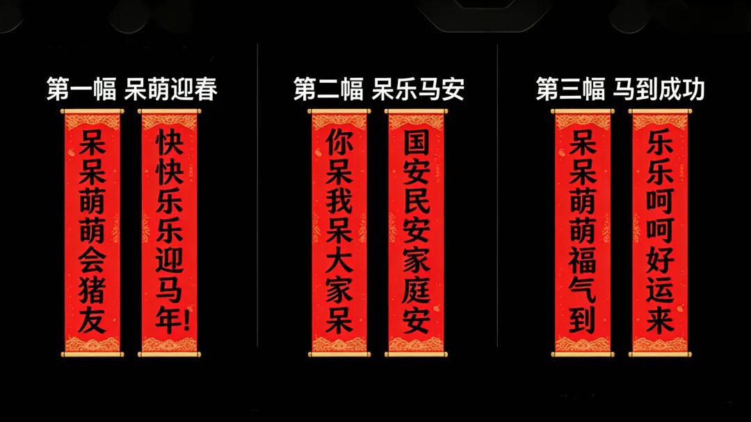 1.呆萌迎春上联:呆呆萌萌会猪友下联:快快乐乐迎马年2.呆乐马安上联:你呆我呆大家呆下联:国安民安家庭安3.马到成功上联:呆呆萌萌福气到下联:乐乐呵呵好运来(个人最喜欢第三幅,简洁又讨喜~)