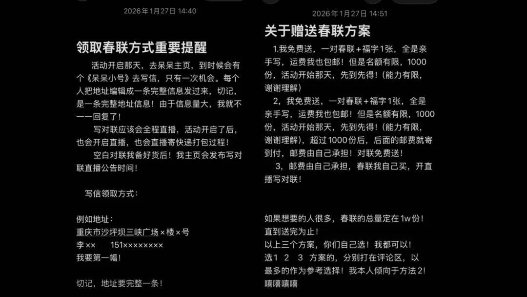 手写春联:一份最朴实的回馈为了报答粉丝这份厚爱,总得表示表示。大伙儿七嘴八舌猜礼物,有人说是杀猪刀,有人猜是比武招亲,结果猜对的是——手写春联!