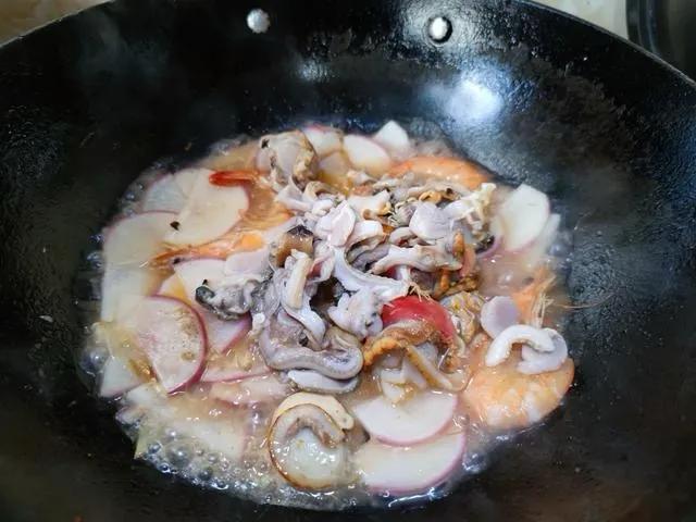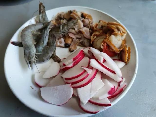 紧接着是栉孔贝,这可是咱中国土生土长的扇贝品种,贝壳上那一个个凸起的小格子就是它的标志。市场上大个的虾贻贝是日本引进的,红壳港湾贝来自美国,要说做瑶柱的原材料,还得是栉孔贝。这贝肉鲜甜,口感极佳。咱来个鲜贝海虾烩萝卜。海虾开背去虾线,栉孔贝拿刷子仔细刷干净,下锅煮开口,取肉把黑内脏去掉,搓洗掉粘液。锅里烧热油,先煎虾,炒出红亮的虾油,下萝卜片煸炒,把萝卜水气炒干。烹入料酒添汤,大火烧开转小火炖到萝卜软烂。这时候把扇贝肉和大蛤肉下锅,煮熟后加盐胡椒粉,收浓汤汁即可。这菜鲜得能把舌头吞下去。