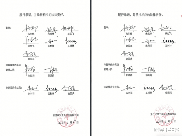 最近网上有声音认为欣兴工具2026年第一版招股书和2026年第二版招股书的董监高签字、公司盖章存在雷同现象。翻了下感觉确实很像,截图在下面。