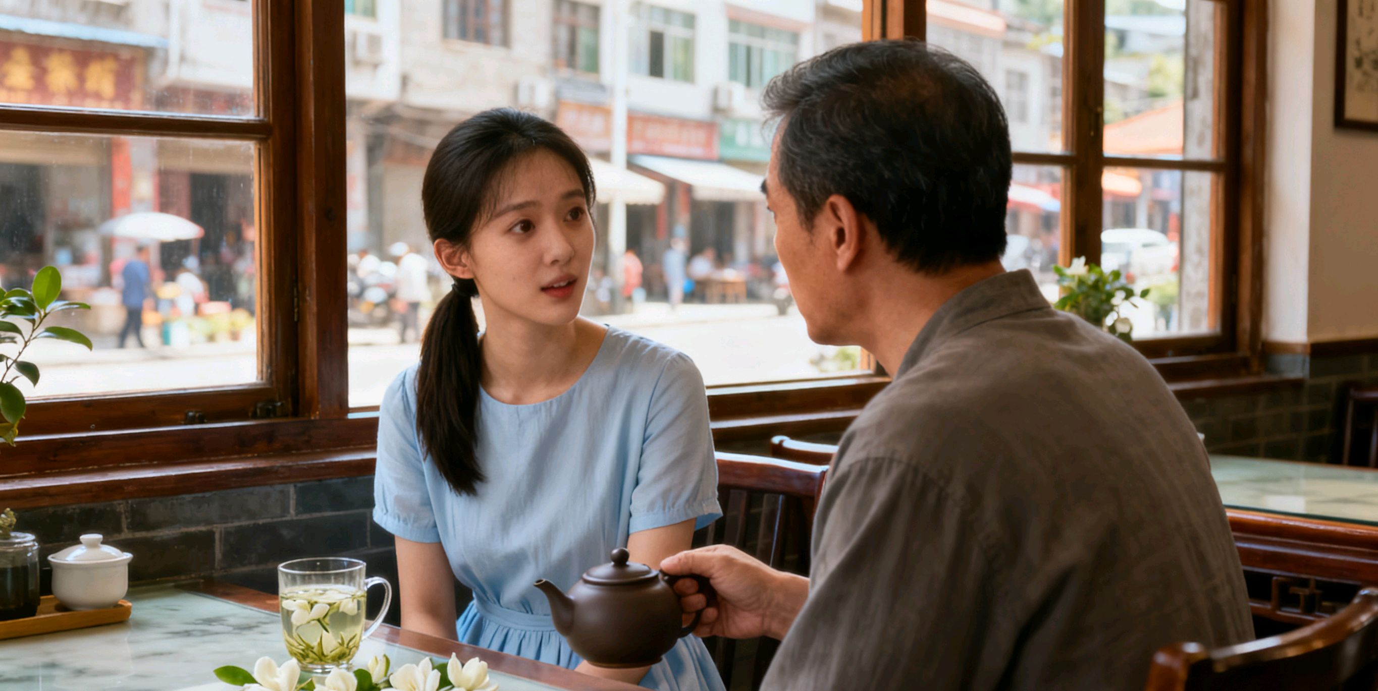 介绍人是我妈跳广场舞认识的张阿姨,她说对方姑娘叫苏晚晴,二十七岁,在县医院做护士,人老实,长得也周正。我提前半小时到了约定的茶馆,选了个靠窗的位置,点了壶茉莉花茶。刚抿了两口,就看见门口进来个穿浅蓝色连衣裙的姑娘,扎着低马尾,手里拎着个白色帆布包,眼睛亮堂堂的,进门就四处张望。