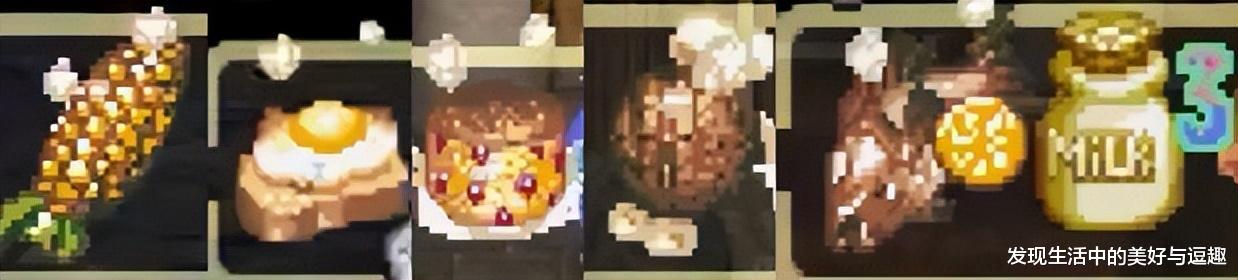这些食物有树上的粉色新鲜的果子,有玉米,有煎蛋饼,也有水果蛋糕,还有大肘子和烤鱼等等。