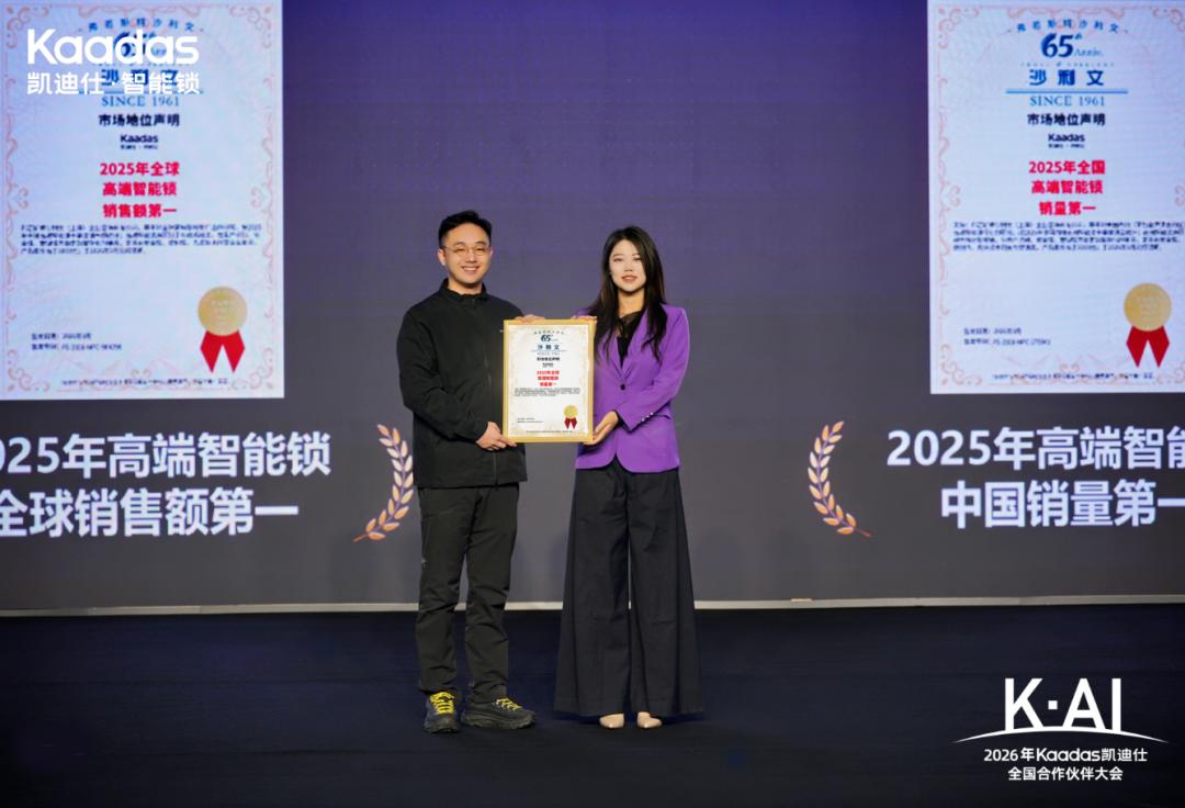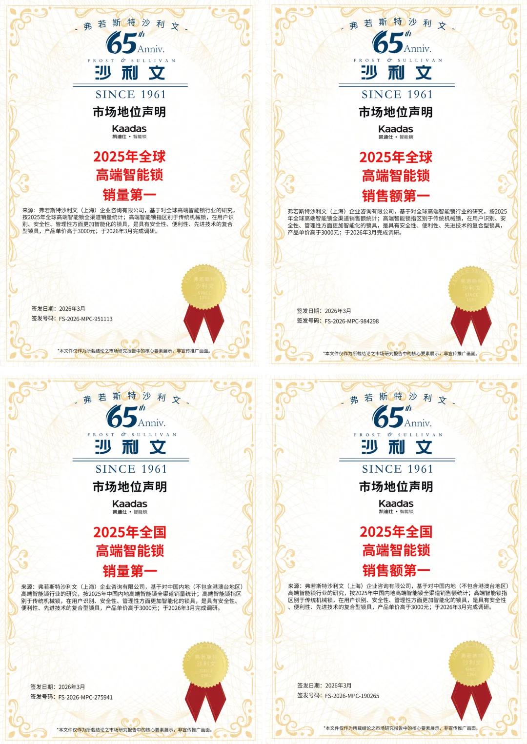 会上,弗若斯特沙利文执行董事李庆带来的数据,则为这次战略升级提供了现实背书。沙利文现场为凯迪仕颁发四项认证:2025年高端智能锁全球销量第一、全球销售额第一、中国销量第一、中国销售额第一。四个第一同时成立,意味着凯迪仕在高端市场的规模与价格带之间已经形成了协同效应——既是销量领先,也是高端智能锁引领者。这是品牌溢价能力的直接体现,也是"成为代名词"的现实基础。