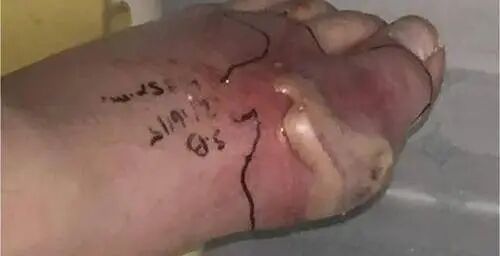 老何,右手食指的痛风石破了。他按照“处理痘痘”的经验,用手挤出了不少白色膏状物,然后擦了点儿碘伏。三天后,整个手指红肿得像萝卜,剧痛难忍,发烧。送医后确诊为 “痛风石破溃伴急性蜂窝织炎、骨髓炎”。医生严肃告知:感染已深入骨质,控制不住可能需要截指。