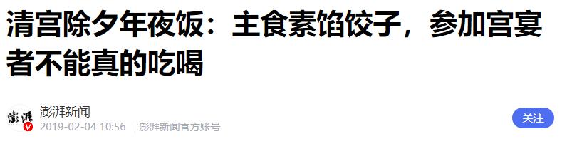 澎湃新闻:清宫除夕年夜饭:主食素馅饺子,参加宫宴者不能真的吃喝 2019-02-04