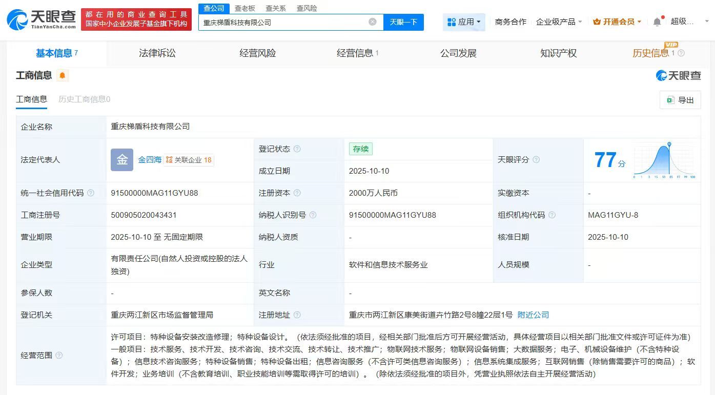 天眼查App显示,近日,重庆梯盾科技有限公司成立,法定代表人为金四海,注册资本2000万人民币,经营范围包括特种设备安装