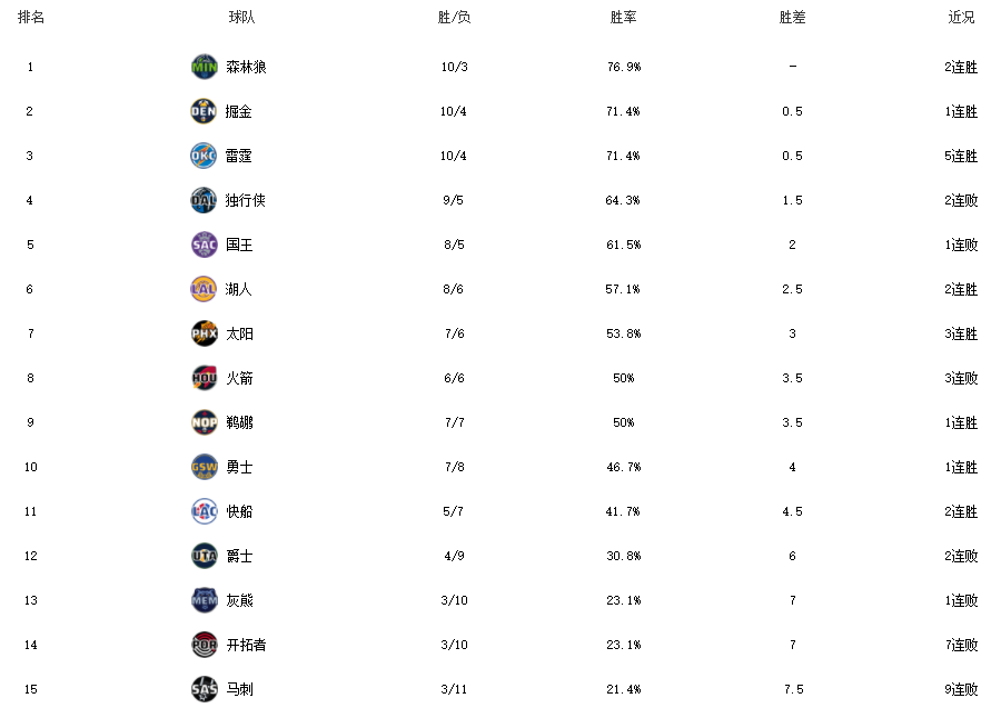 西部方面,前四的变化不大,前三名的森林狼、掘金和雷霆都是连胜在手,独行侠则是由于2连败跌至第四。西部竞争较为激烈的是5-8名之间,其中湖人、太阳和火箭都是大家熟悉的球队,球迷们对他们新赛季的前景也充满了期待。今天湖人和太阳没有比赛,排名没有变化,而火箭虽然是遭遇了3连败,但是仍然排在前八。火箭这3场比赛输得非常可惜,每一场都是输在了最后时刻上,球队缺乏真正的大牌球星在这几场比赛里体现得很明显。而依靠击败火箭结束6连败的勇士队,则是凭借这场比赛重新回到了前十行列。
