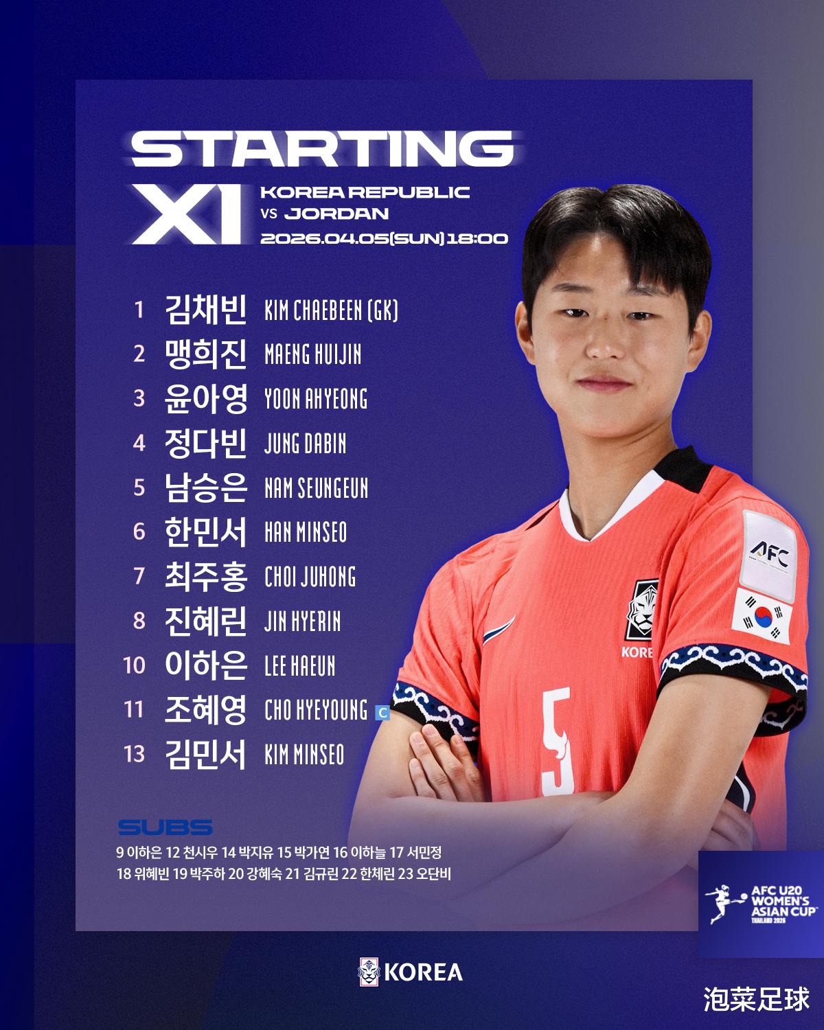 MF:13-金敏舒,8-陈慧琳(15-朴佳妍HT),7-崔柱洪(17-徐旼廷84'),11-赵慧英(9-李河恩27')