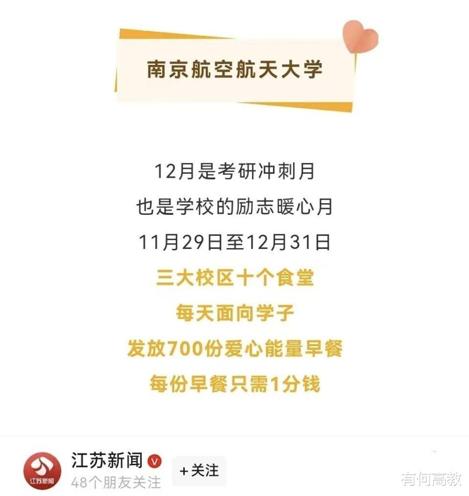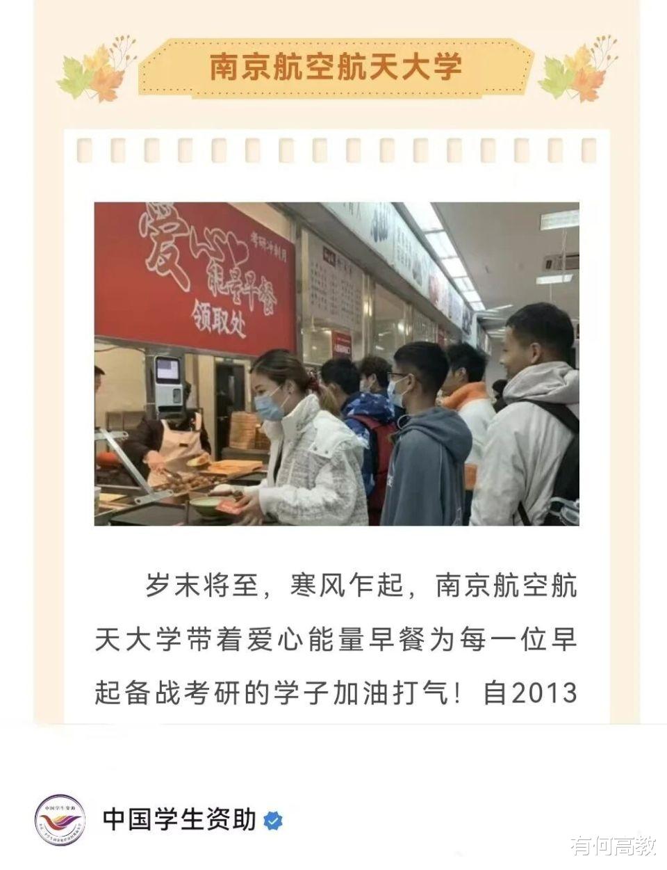每年12月是考研冲刺月也是我校励志暖心月每一年励志暖心月的清晨早起奋斗的南航学子们就争先恐后来到食堂领取一份爱心能量早餐