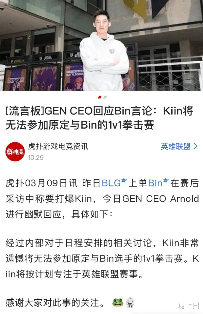 “经过内部对于日程安排的相关讨论,Kiin非常遗憾将无法参加原定与Bin选手的1v1拳击赛。Kiin将按计划专注于英雄联盟赛事。”