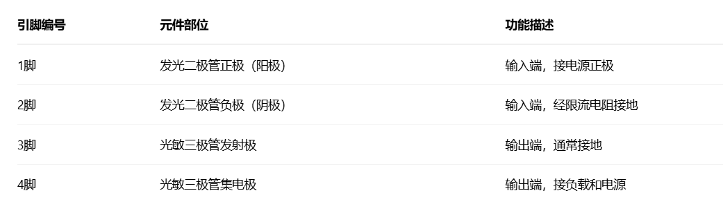 引脚定义:一般情况下,①脚是发光二极管的正极(阳极),②脚是发光二极管的负极(阴极),③脚是光敏三极管的发射极,④脚是光敏三极管的集电极。