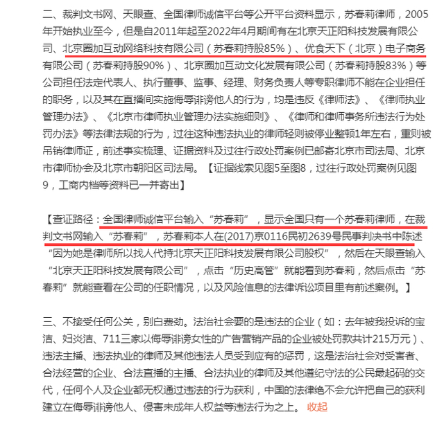 除了张兰,邓高静律师还连张兰的律师苏春莉一起告上法庭,并表示该律师多次违反律师法,私自注册企业,有违律师执业程序。