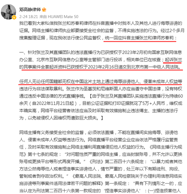 2月24日,消失两个月的邓高静律师正式向张兰宣战,她说经过两个月的收集整理,目前已将张兰及其直播团队的违法行为向网信办进行投诉,相关单位正在核查,2月16日,她将张兰侮辱诽谤的全套资料递交到北京市第一中级人民法院。