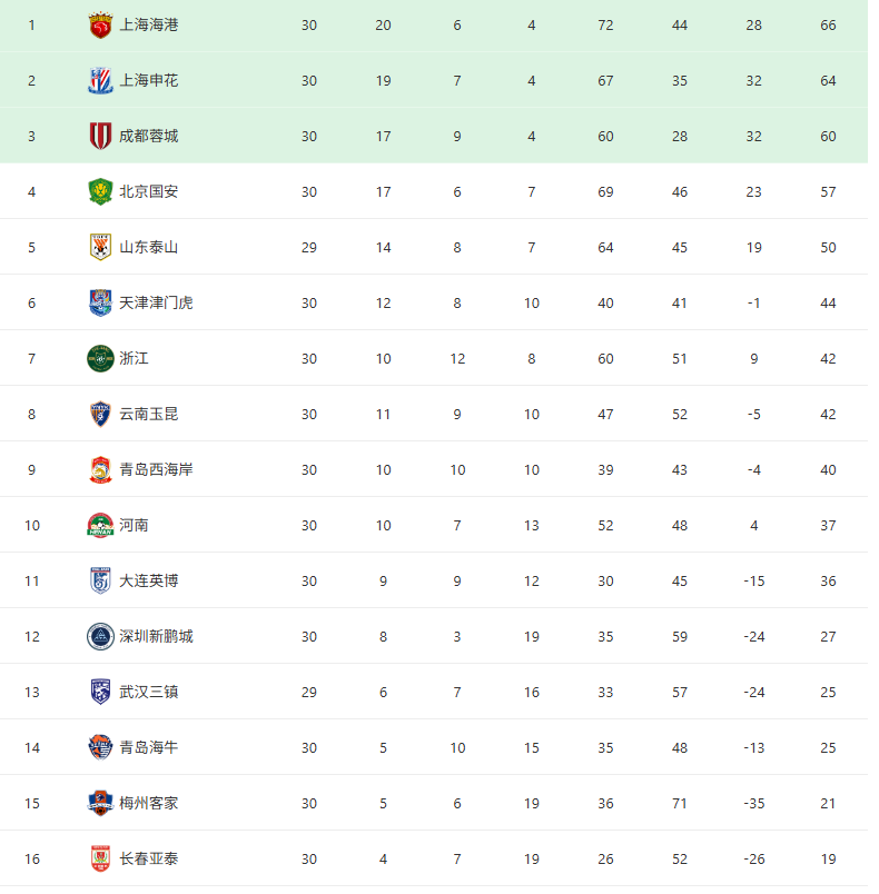 立冬已过,小雪已至,中超在今天迎来了赛季大结局,在事关争冠的两场对决里,上海海港在客场1-0拿下大连英博,以66分豪取联赛三连冠;而上海申花则3-1战胜天津津门虎,以2分之差获得亚军。保级之战上,青岛海牛客场2-2战平浙江成功保级,梅州客家1-5惨败北京国安遗憾降级。在金靴之争里,法比奥上演大四喜斩获28球获得金靴,瓦科梅开二度以27球拿到银靴。