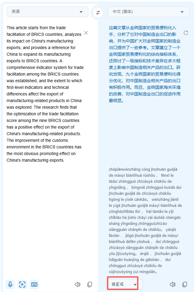 翻译成英文之后,我们复制到必应翻译回中文,一定要选择(非正式):