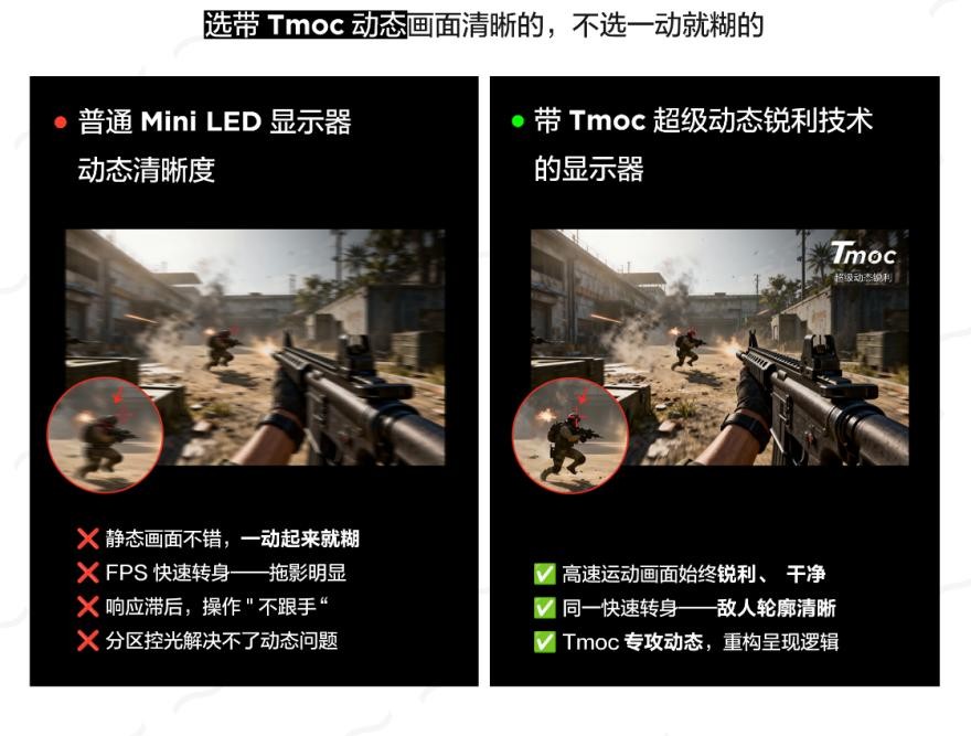 除了最基础的刷新率、分辨率,还需要考虑面板、背光响应能不能精准同步,不然一动起来该糊还是会糊。C3A Pro不仅支持4K 165Hz与FHD 320Hz无缝切换,还通过Tmoc超级动态锐利技术,有效消除运动画面的拖影、模糊。在兼顾高刷新率和高分辨率的同时,守住画质,高速运动画面依旧清晰锐利
