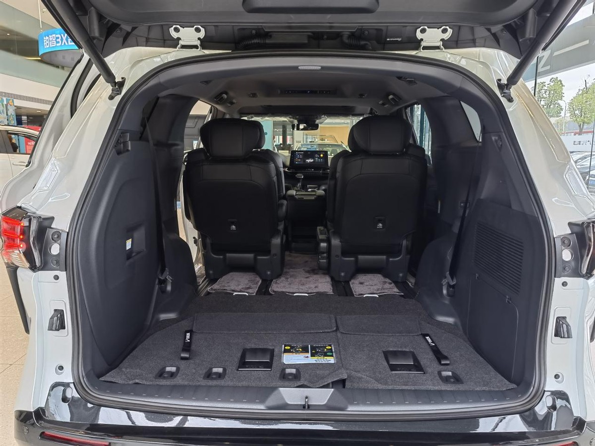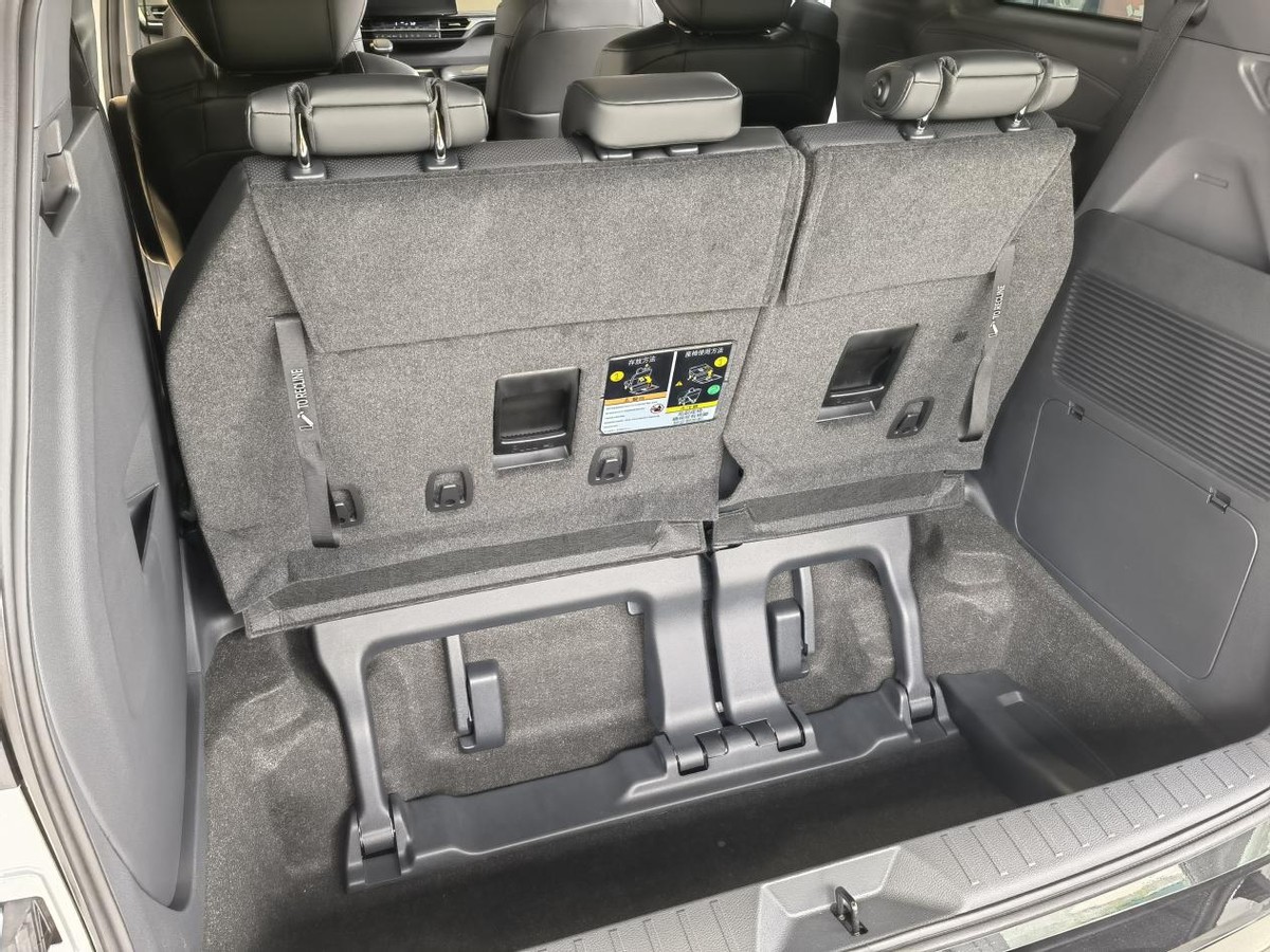 三排座椅的收放必须手动推拉,两个动作步骤可以完成,不算很麻烦,但是要注意力道和角度。这个拉环除了辅助折叠推拉,还负责调节三排座椅靠背。三排座椅推起后,会腾出下沉式的后备厢空间,可以放下多个行李箱、折叠儿童椅等大件物品,即便满员满载跑长途也能一车搞定。