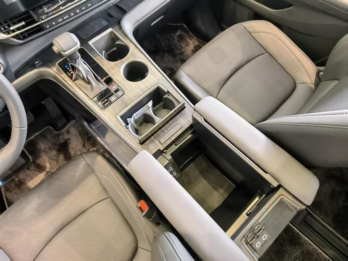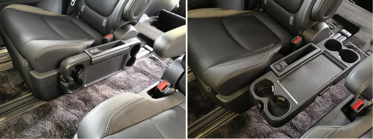 赛那的小桌板并没有放在前排椅背,而是给二排座椅侧面安排了一个折叠置物板,轻轻按住下方的小机关向上翻,就能放平固定。这种设计,也没有挤占中间过道空间。置物板除了杯托,旁边还有两个type-c充电口,二排乘客、三排乘客需要给手机、平板充电,它都能兼顾到。