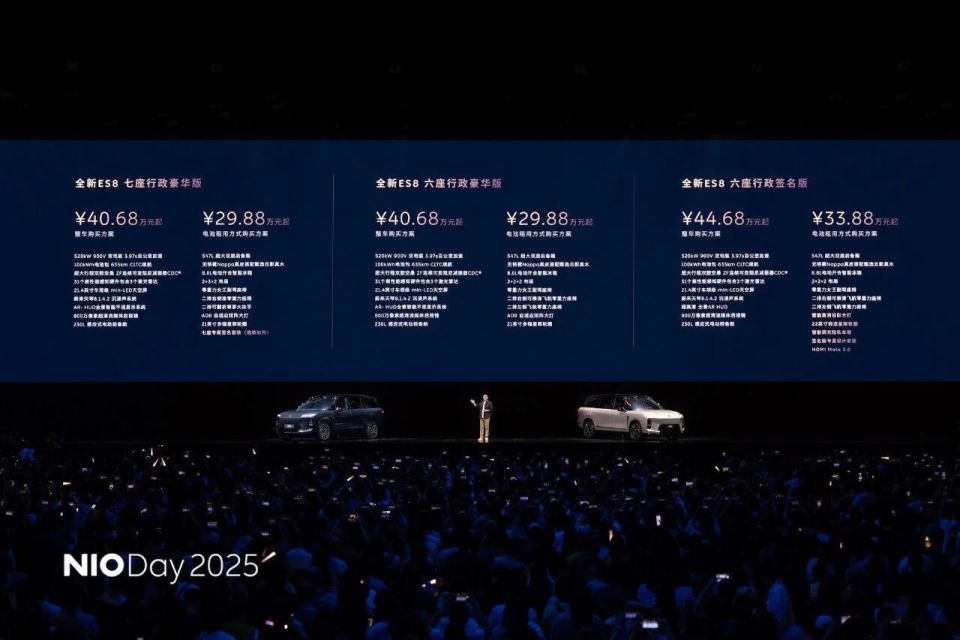 全新ES8共有一款七座、两款六座配置,整车购买价格是40.68万和44.68万元起,如果采用BaaS电池租赁方案,仅为29.88万元和33.98万元,比上一代车型上市时便宜近12万,比已经引发热潮的预售价格各降了一万。