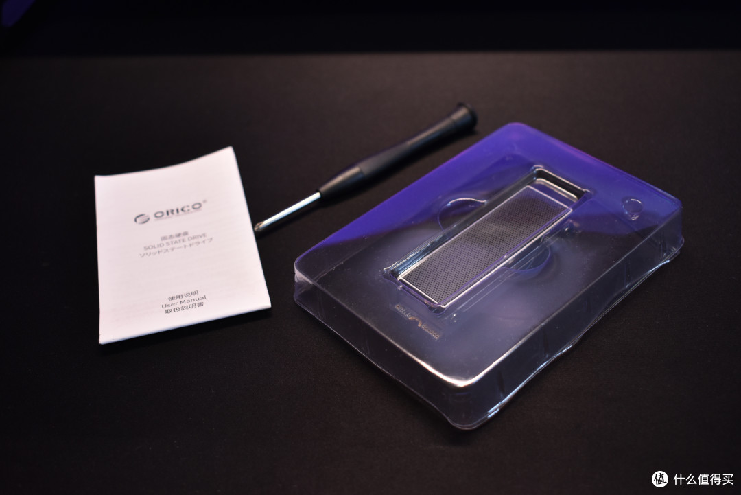 拆开包装盒,就可以看到SSD本体,透明塑料壳包裹着的硬盘,旁边有一个用于固定硬盘的螺丝以及工具。