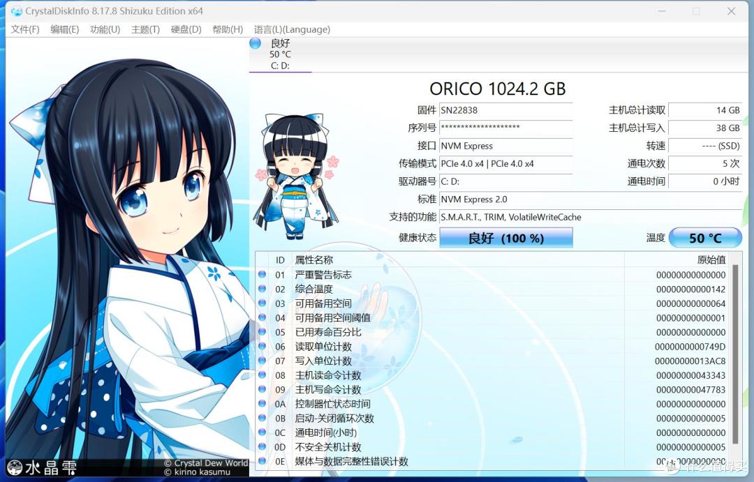 奥睿科 OSC 冰甲固态硬盘运行在PCle Gen 4.0 * 4通道下,并且支持NVM Express 2.0和动态写入缓存技术,室温27℃情况下硬盘温度稳定在50℃上下。自此,我们便已经得知这块固态硬盘的基本性能与配置,下一步自然是实际测试了。