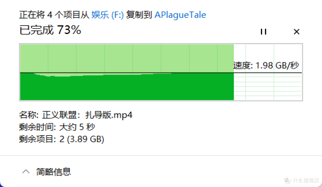 实际体验中,拷贝一个大小超过10G的视频文件到奥睿科 OSC 冰甲固态硬盘中,短短几秒即可拷贝完成,平均写入速度是1.98G/s。全程的速度也是非常稳定,这样的写入对于日常经常交换大容量数据的用户来说,能够提升不少的效率。