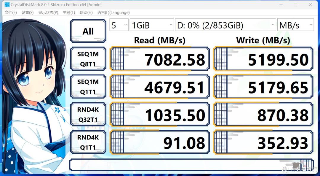 测试结果显示,奥睿科 OSC 冰甲固态硬盘的连续读取速度达到了 7082MB/s 左右,连续写入速度也稳定在 5199MB/s 上下,我拿到的这款是1T容量的,这样的连续读写速度在同级别产品中处于上游水平,能够满足用户日常的文件传输、视频编辑等需求。