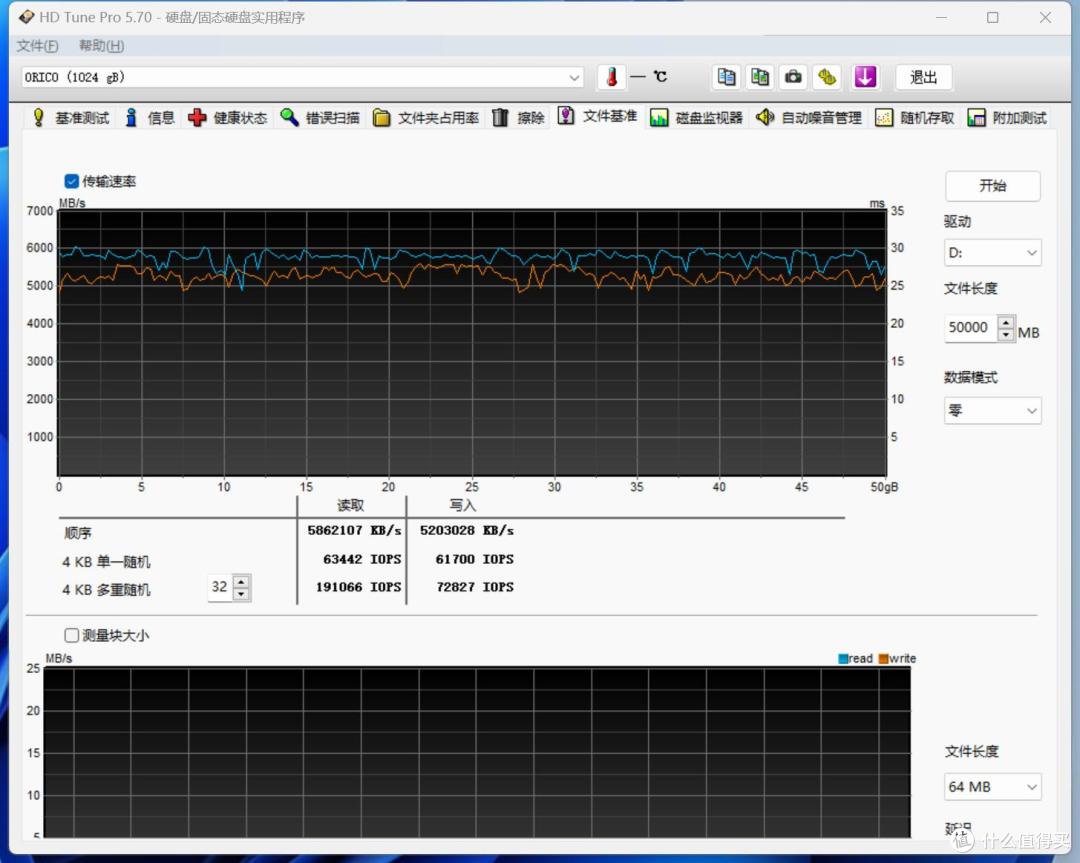 在HD Tune Pro中,测试50GB写入数据,奥睿科 OSC 冰甲固态硬盘能够一直维持着高速读写状态,整体表现非常稳健,即便长时间高负载运行,硬盘也未出现降速现象,保证了数据传输的连续性,为稳定使用提供保障。