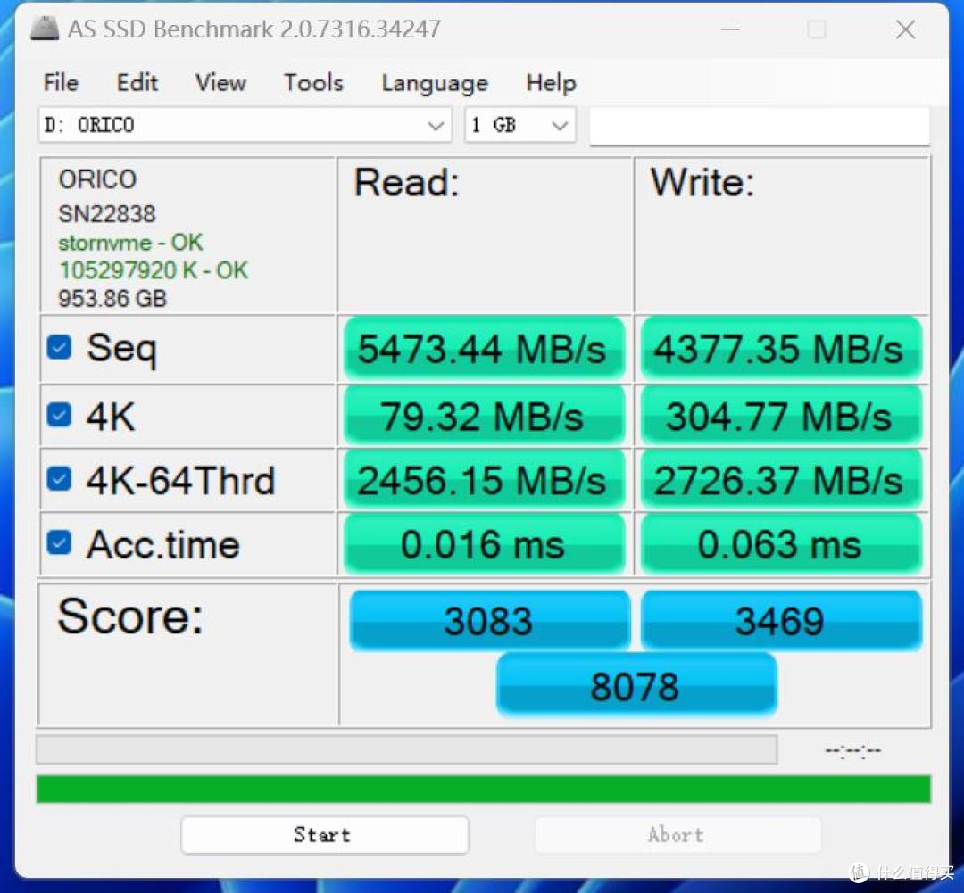 实测奥睿科 OSC 冰甲固态硬盘的读取速度5473MB/s,写入速度4377MB/s。在随机读写测试中,4K 随机读取速度约为79MB/s,4K 随机写入速度约为3304MB/s。总得分来到8078分,这一成绩表现出色,意味着在运行操作系统、加载应用程序时能够更加流畅,有效缩短等待时间。