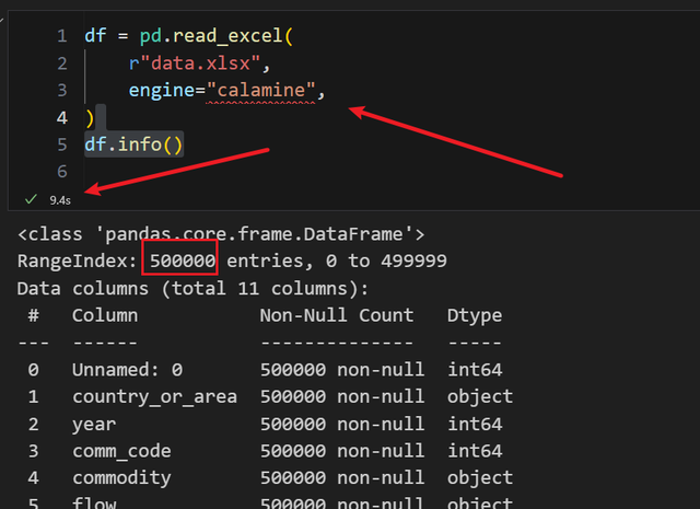 现在看看使用 calamine 引擎,加载到 dataframe 要多久: