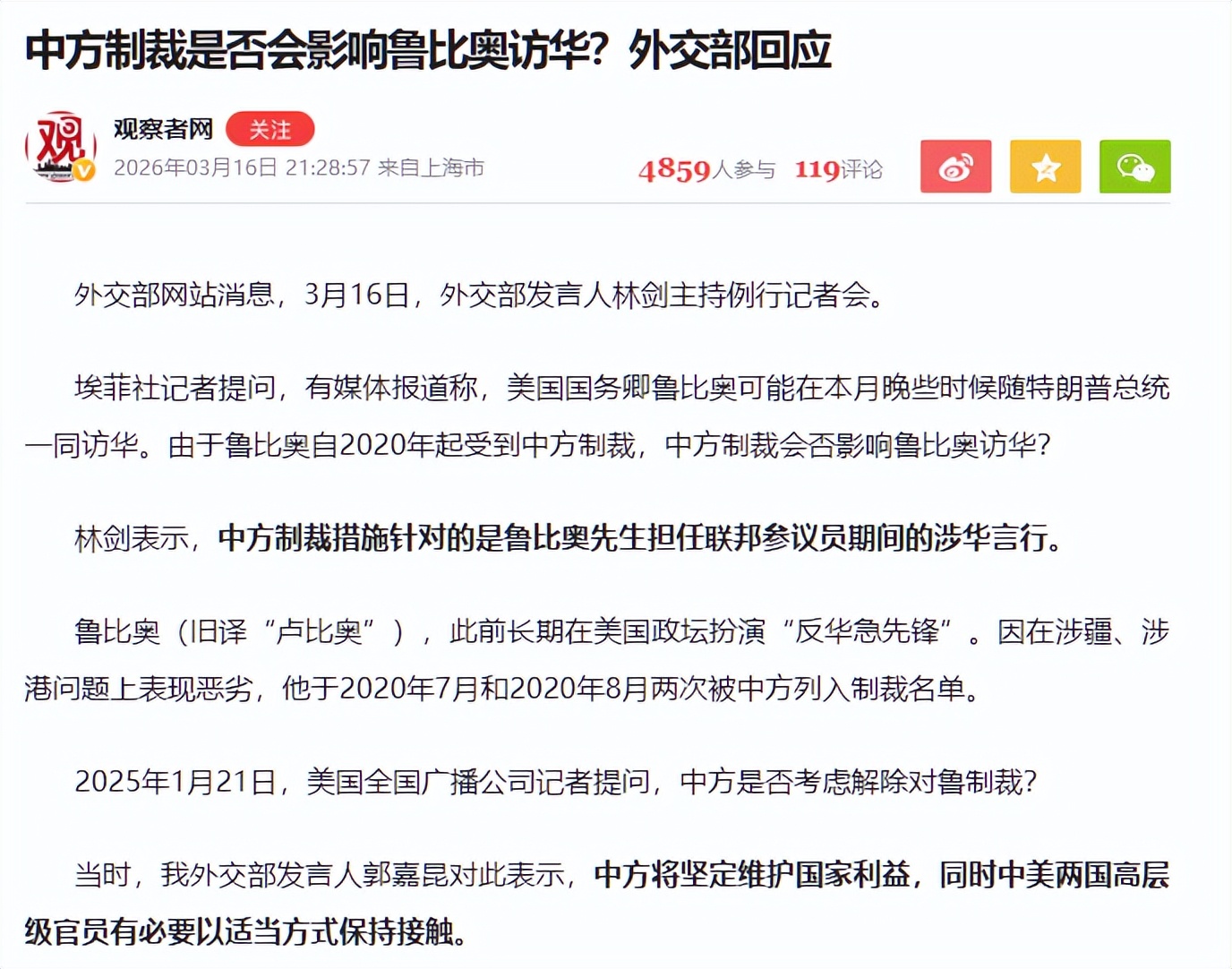 视线转回东方,这里没有水坑,只有不可逾越的红线。外交部的话很硬:制裁针对的是鲁比奥担任参议员期间的恶劣言行。