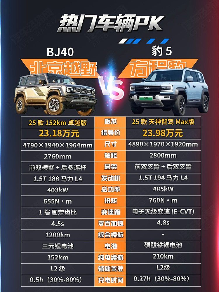 方程豹 豹5 2025款天神智驾Max版售价为23.98万元,北京越野BJ40增程2025款卓越版售价为23.18万元。