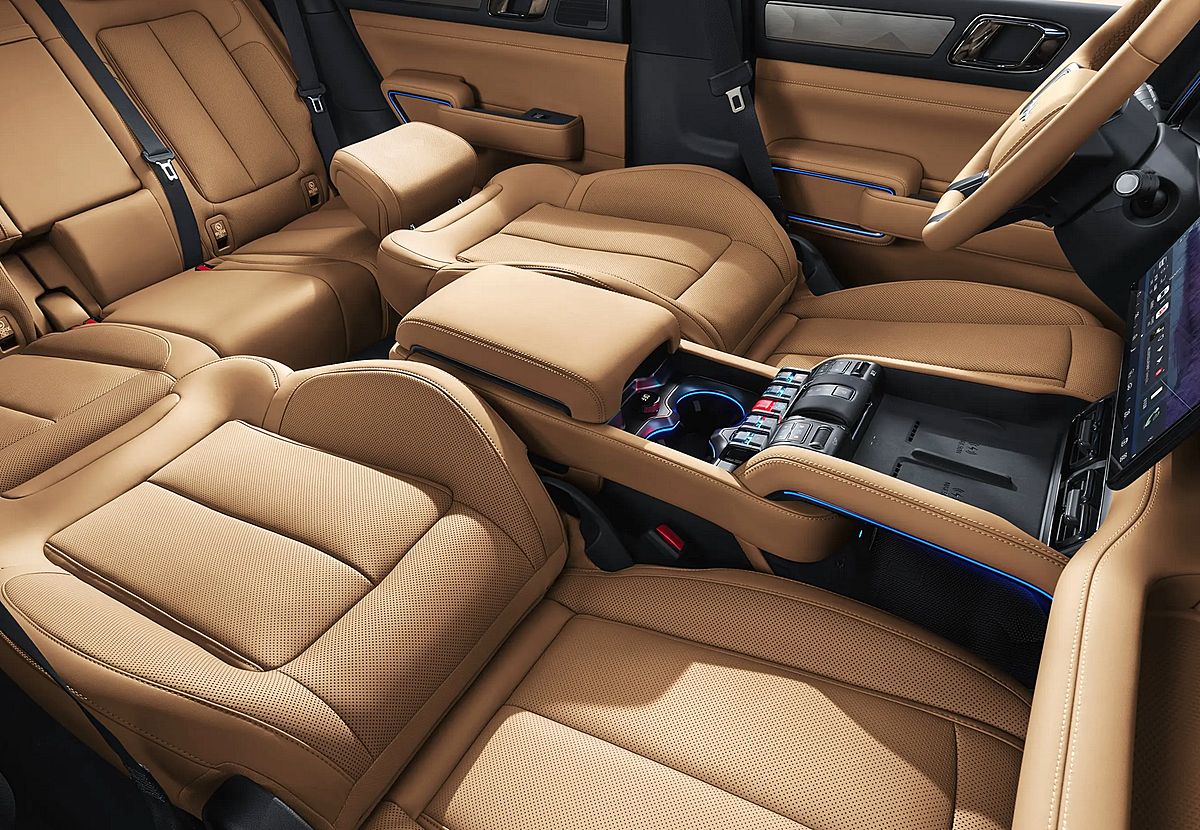 内饰设计在保留燃油版车型实用布局的基础上,融入了更多科技化配置,并提供了两种不同的座舱配色方案以供选择,兼顾了舒适性与现代感。智能座舱的核心是10.25英寸的全液晶仪表盘和双12.8英寸的中控屏与副驾娱乐屏,车机系统内置了高通骁龙8155芯片,保证了操作界面的流畅度和响应速度;在实用配置上,其后备厢提供了220V电源接口,极大地便利了户外用电的需求。