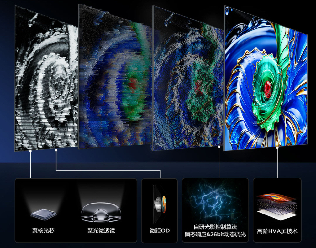 画质的根基,在于控光精度,控光越精准,画面对比度表现就越出色。行业普遍存在盲目堆砌分区的现象,但分区数量越多,光线反而越难把控,极易产生光晕问题。QD-Mini LED P12L没有陷入这类无效内卷,而是用万象分区技术重构控光逻辑,打出“一区顶多区”的高效解方。从Mini LED发光芯片到屏幕,实现全链路像素级精准调控,独立驱动每一块控光区域,彻底解决传统电视光晕弥散、亮部过曝、暗部模糊的问题。