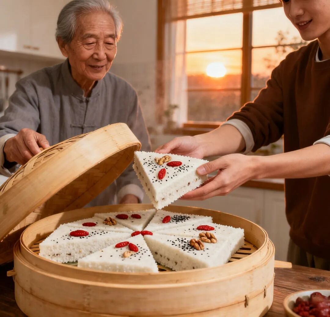 这天可少不了要尝点“重阳专属味道”。倒一杯菊花酒,抿一口带着花香的清甜,老辈人说这能祛病延年,其实不管有没有这说法,光是这份仪式感就够让人开心的。再咬一口重阳糕,软糯的糕体裹着豆沙或果仁,和家人朋友坐在一起,边吃边唠唠最近的家常,你说的趣事他笑,他讲的琐事你听,心里暖乎乎的,比糕还甜。