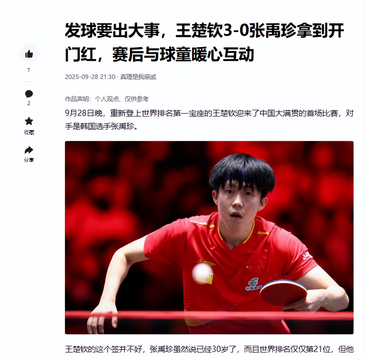 关注本号的读者一定还记得,我在去年9月28日王楚钦战胜张禹珍后发文(标题为《发球要出大事,王楚钦3-0张禹珍拿到开门红,赛后与球童暖心互动》,可搜索)对此早有预言。