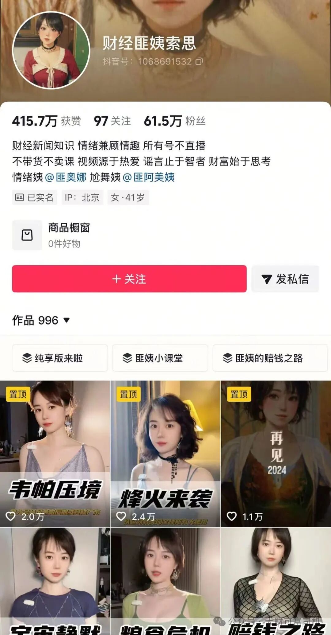 而把这套“擦边引流+粉丝变现”玩到极致的,当属抖音近62万粉的“财经匪姨索思”。