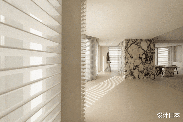 日光被赋予了细腻而温柔的特质,它通过某种形式的筛滤,如树叶的缝隙或是精心设计的遮阳结构,转化成了背景上一幅幅细腻的光影画。这些光影不仅增添了空间的层次感,还与自然界的明暗变化交织在一起,创造出一种视觉上的渐进效果,仿佛空间本身都拥有了呼吸和灵性,特别是当这些光影落在几何形状的家具或建筑体块上时,更添几分生动与活力。