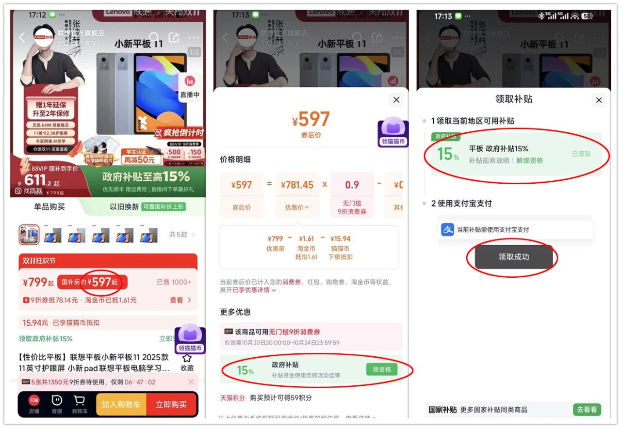 我用自己号简单测了一下,居然可以领取那个15%的政府补贴,本来我江西南昌从9月10日停止国补后,目前都没恢复,说明那个补贴不是区域补贴。目前我显示是597元,还没算淘金币等手段,难怪那个爆料点值率是94%,大多数人不会卡在国补这关。