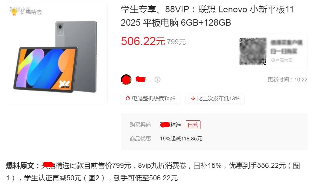 根据张大妈爆料,某猫原价799元的联想小新平板11 2025款(6G+128G),通过国补15%和88VIP九折券,再叠加学生认证减50元后,最低实付506.22元。但这还没算上给淘金币,爆料人又在评论区补充淘金币可以抵扣71.9元,极限低价可以下探到四百多元。