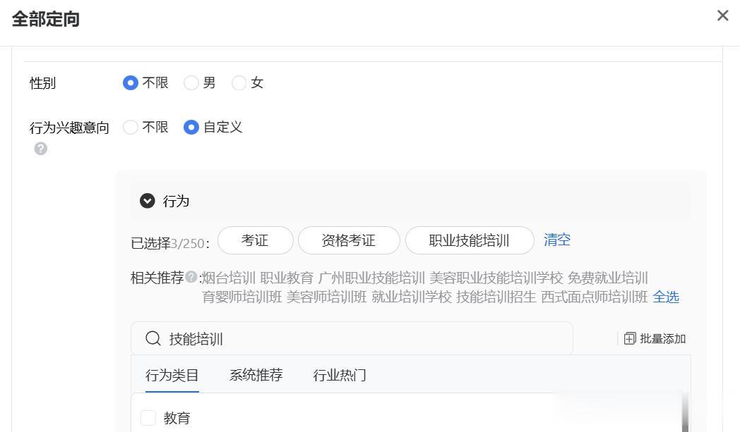 此外,地域定向要细化到 “城市 + 商圈”。比如在上海徐汇区开设线下班,除了定向上海,还可添加 “徐家汇商圈”“漕河泾开发区” 等,吸引周边通勤人群;若主打线上课程,则可覆盖全国,但需排除偏远地区,降低无效咨询。
