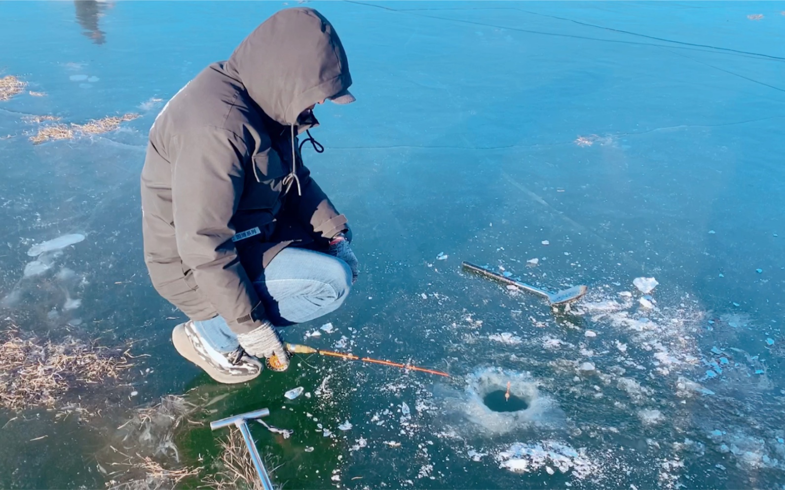 首先冰钓的钓友们一定要在冰层足够厚的冰面上进行这项运动,但是因为天气寒冷的原因,我们只知道湖面上结冰了,很难判断这些冰结了多厚。