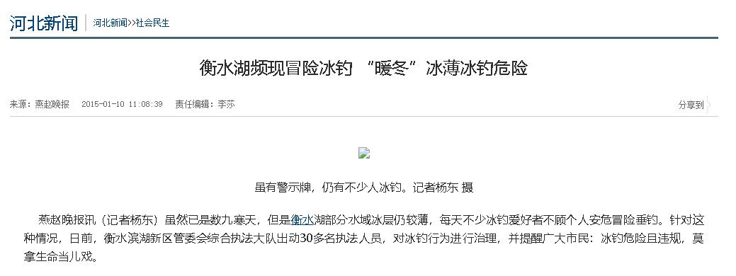 4、原文刊登于河北新闻2015-01-10发布的关于《衡水湖频现冒险冰钓 “暖冬”冰薄冰钓危险》的报道;