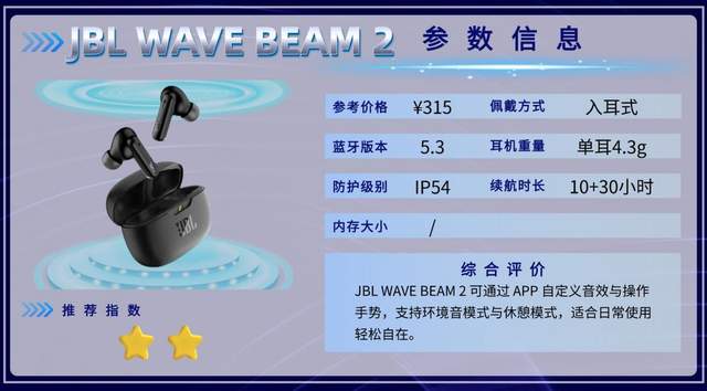 JBL WAVE BEAM 2更适合日常佩戴、通勤和轻度运动,通过APP可调节音质和环境音模式,灵活性高。运动适合度一般,若是激烈运动或长时间户外训练,佩戴稳定性可能略显不足。