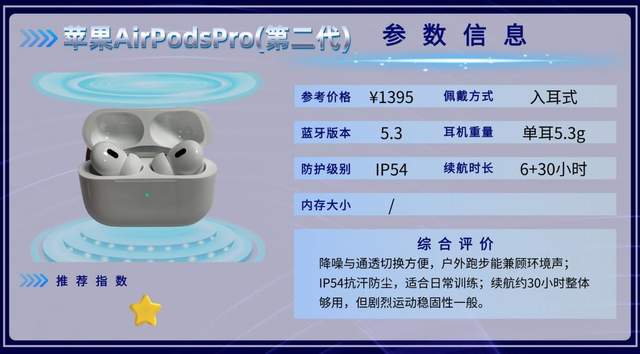 AirPods Pro 2音质均衡、佩戴舒适、降噪和通透功能实用,续航单次6小时,搭配MagSafe充电盒可达30小时,快充和查找功能方便日常使用。整体偏向日常听歌、通勤和轻运动场景,防水和运动稳固性属于基础水平。