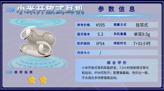 小米开放式耳机佩戴舒适、轻量,但防水能力和音质表现一般,更适合日常使用或轻度运动。整体配置相对普通,性价比表现不算高,如果追求专业运动或防护能力,可能不是最佳选择。