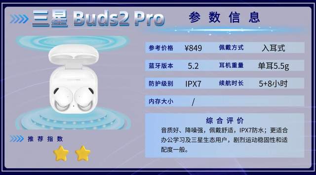 三星Buds2 Pro音质高解析、佩戴舒适、功能精致,续航表现标准(官方未特别标明,但可轻松日常使用),IPX7防水基础防护,适合办公、学习或三星设备用户,日常通勤也方便,但不适合高强度运动或跑步场景。