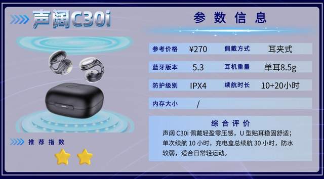 C30i单次续航10小时,总续航30小时,充电10分钟可用3小时,续航够日常使用或轻度运动。轻量化佩戴体验不错,音质平稳,但防水和运动稳固性一般,更适合日常通勤或轻运动场景,强烈运动需求用户可能需要考虑更高防护等级的型号。
