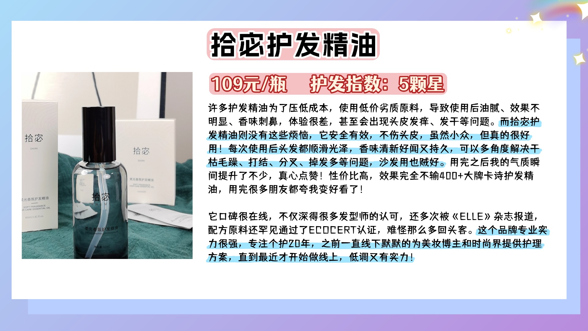 卷发党问护发精油咋样才管用?还有怎么用才不塌卷?对卷发来说,选对精油能让卷度更有弹性,还能减少毛躁!首先要选滋润但不厚重的精油,避开浓稠的油膏状,不然会让卷发变塌、黏在一起,其次用法要注意,洗完头吹到半干,取 1-2 泵精油搓热,顺着卷发纹理轻轻抓揉,不是来回梳,这样能保住卷度,还能抚平毛躁。另外日常出门前也能涂一点,能减少静电,让卷发更服帖,不过用量要控制,多了会影响卷度蓬松感。别用错方法浪费精油,找对技巧才能让卷发又顺又有型。接下来分享我选购护发精油时的一些经验,都是实测出来的干货,建议先收藏慢慢看!