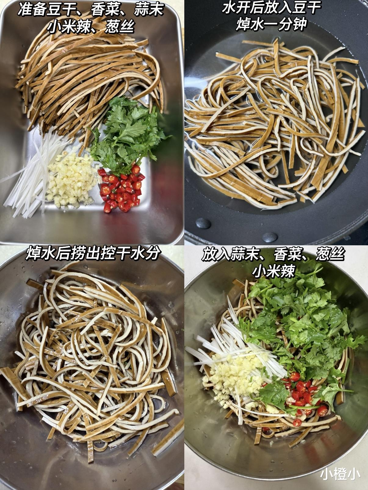 A:买“北豆腐干”或“茶干”,别选“内酯豆腐干”;焯水后过冷水,动作轻,保准完整。